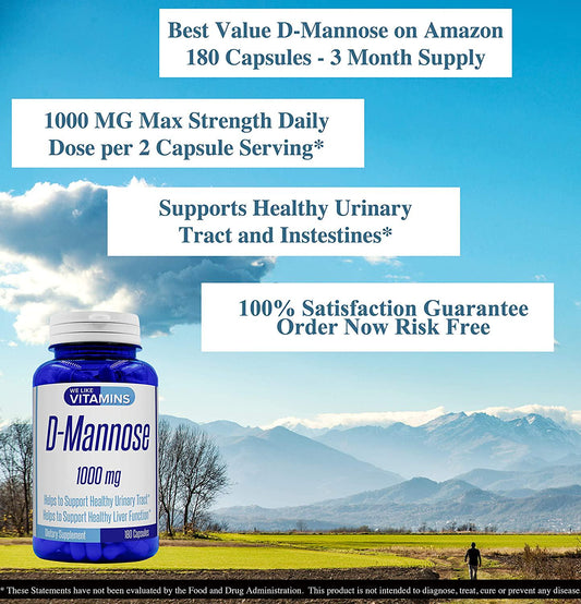 D-Mannose 1000mg per Serving 180 Capsules - 3 Month Supply - D Mannose Supplement with UTI Support in D-Mannose Capsules Helps Support Bladder and Urinary Tract Health