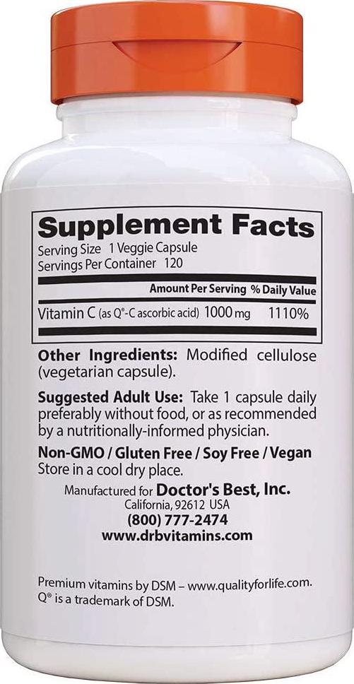 Doctor's Best Vitamin C with QualiC 1000 mg NonGMO Vegan Gluten Free Soy Free Sourced from Scotland Veggie Caps, 120 Count