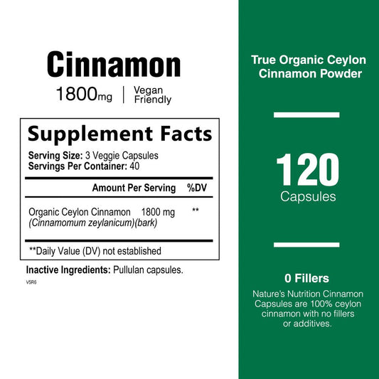 Ceylon Cinnamon Capsules, Certified Organic Ceylon Cinnamon Pills 1800 Mg per Serving, Non-Gmo, Gluten-Free Sri Lanka Pure Cinnamon Pills Supplement, Sugar Free, Vegan - 120 Count Vegetarian Capsules
