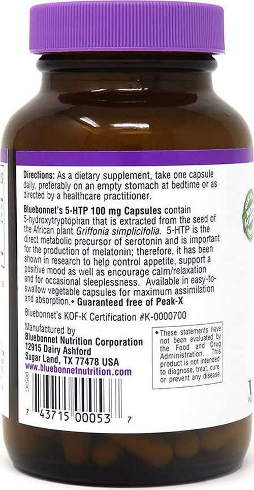 Bluebonnet Nutrition 5-HTP(Hydroxytrypophan) 100mg, for Neurotransmitter Support*, Supports Positive Mood*, Soy-Free, Gluten-Free, Non-GMO, Kosher Certified, Vegan, White,120 Vegetable Capsule