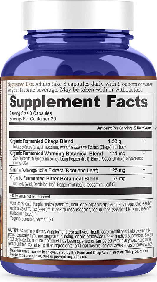 Ancient Apothecary Fermented Chaga Mushroom Supplement, 90 Capsules Infused with Organic Essential Oils, Ashwagandha Extract and Digestive Bitters