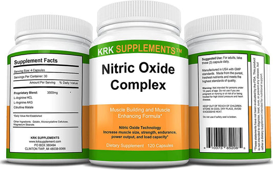 1 Bottle Nitric Oxide Complex 3500mg Per Serving L-Arginine HCL AAKG AKG Alpha Ketoglutarate Citrulline Malate 120 Capsules KRK Supplements