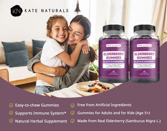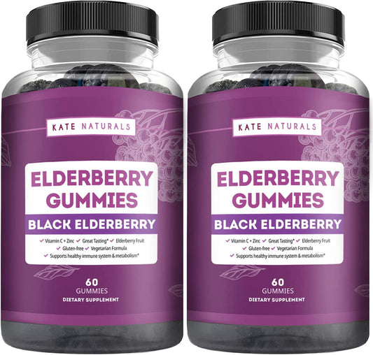 Elderberry Gummies for Adults - Kate Naturals. Perfect for Immune System Support and Metabolism. Raspberry Flavor. Has Vitamin C and Zinc. Sambucus Nigra. Tasty Vitamins Alternatives. (2 Pack)