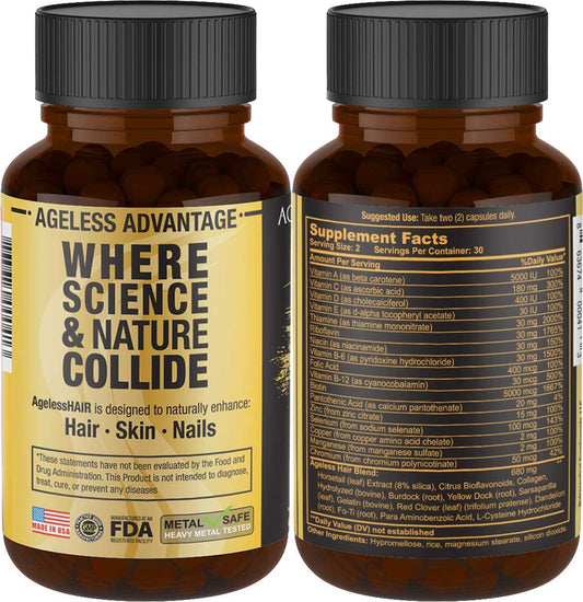 AgelessHAIR - Premium Hair Growth Formula for Healthier, Stronger, Shinier Hair - All Natural Supplements Including Biotin, Collagen, Vitamin A, Horsetail Leaf Extract - 60 Veggie Capsules