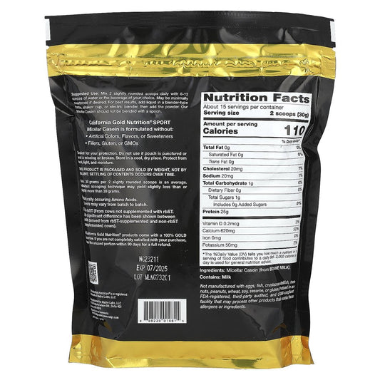 California Gold Nutrition SPORT - Micellar Casein, Unflavored, Slow Absorption, 16 Oz (454 G)
