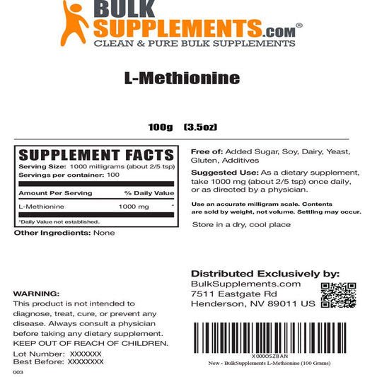 Bulksupplements.Com L-Methionine Powder, 1000Mg - Kidney & Liver Support (100G - 100 Servings)