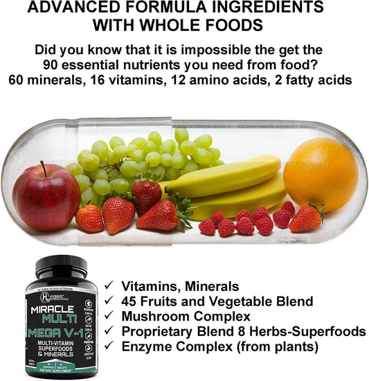MEGA V-1 Multi Vitamins Minerals Blend, Daily Multivitamin Mineral Supplement, Probiotics, Superfood Digestive Enzyme Blend, Mushroom Complex, for Heart, Immune Support, Stamina, Energy (90 Servings)