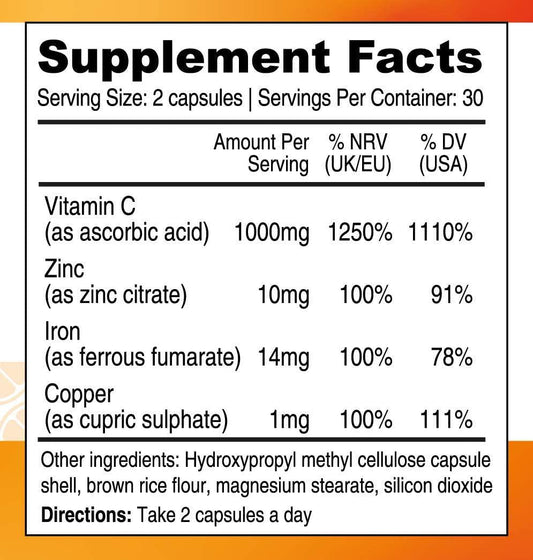 Mega Vitamin C 1000mg Plus Zinc, Iron and Copper. Powerful Immune System Boost. Sugar-Free, Gluten-Free. 60 Capsules - 1 Month Supply.
