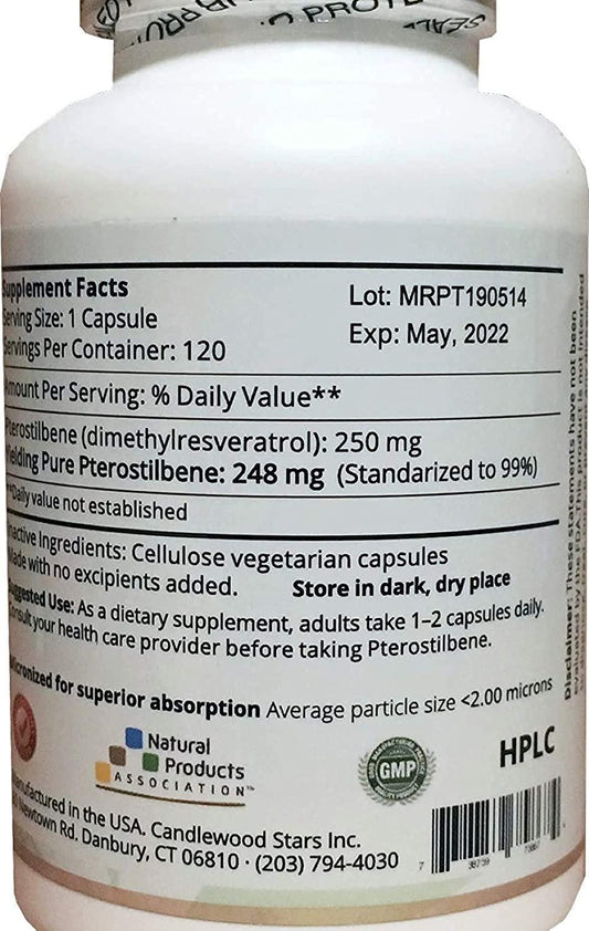 Mega Pterostilbene, 99% Pure, Micronized Trans-Pterostilbene, 250 MG - 120 Vegetarian Capsules. Excipients Free. Manufactured in The USA. Limited Time Sale!