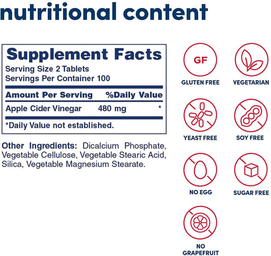 American Health Apple Cider Vinegar Tablets (2 Pack) - Balanced Diet and Exercise Program Support, No Tart Vinegar Taste - Non-GMO, Gluten-Free, Vegetarian - 480 mg, 200 Count - 200 Total Servings