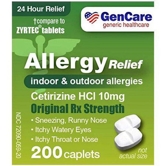 Gencare Cetirizine HCL 10 Mg (200 Count) | 24 Hour Non Drowsy Allergy Relief Pills | Best Value Generic OTC Allergy Medication | Antihistamine for Sneezing, Runny Nose and Itchy Eyes | Generic Zyrtec