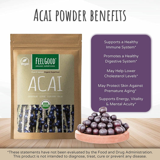 FeelGood Organic Superfoods Acai Powder, Vegan, Non-GMO, Gluten Free, Antioxidant for Acai Berry Tea, Acai Bowls, and Acai Smoothies, 4 oz