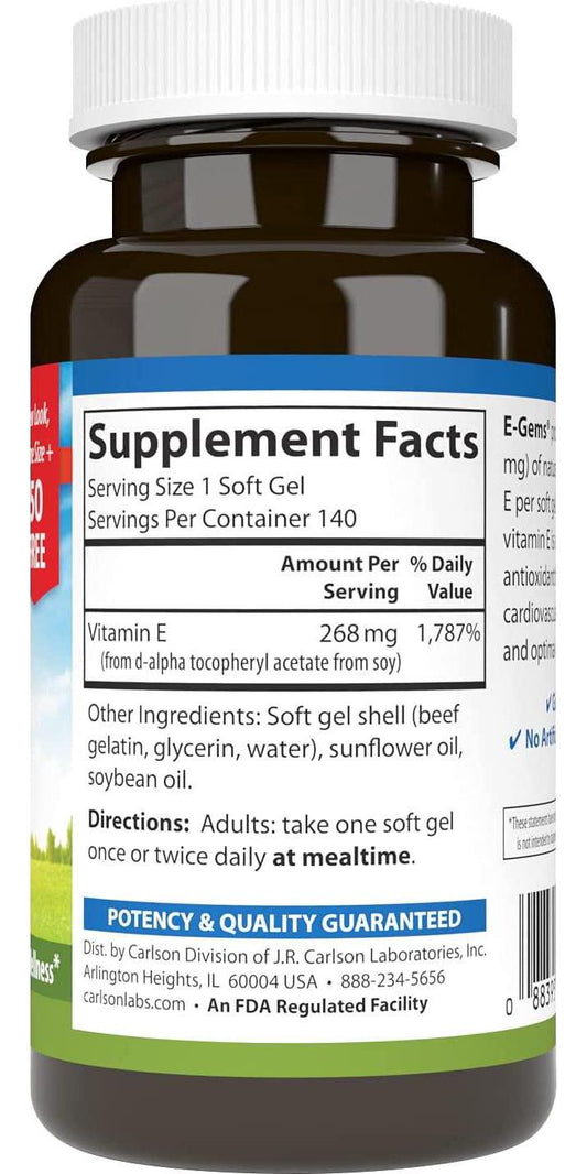 Carlson - E-Gems, 400 IU (268 mg), Natural-Source Vitamin E, Heart Health and Optimal Wellness, Antioxidant, 140 Soft Gels