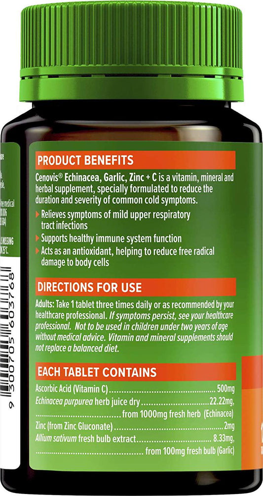 Cenovis Echinacea, Garlic, Zinc + C - Reduces Duration and Severity of Common Cold Symptoms - Antioxidant, 125 Tablets, Mostly Green (Pack of 1)