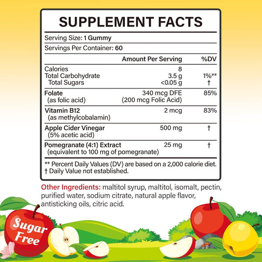 Apple Cider Vinegar Gummies with Vitamin B6, B12 and Folic Acid | for Cleansing, Metabolism, Energy Boost and Immunity Dietary Supplement | 60 ACV Gummies with The Mother