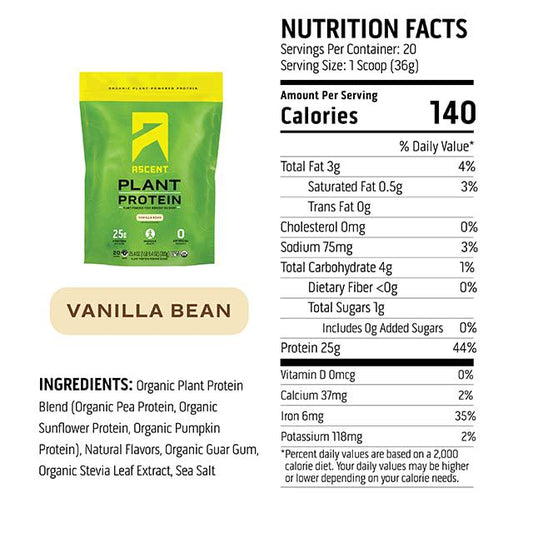 Ascent Organic Plant Based Protein Powder - Non Dairy Vegan Protein, Zero Artificial Ingredients, Soy and Gluten Free, No Added Sugar, 4g BCAA, 2g Leucine - Vanilla, 20 Servings