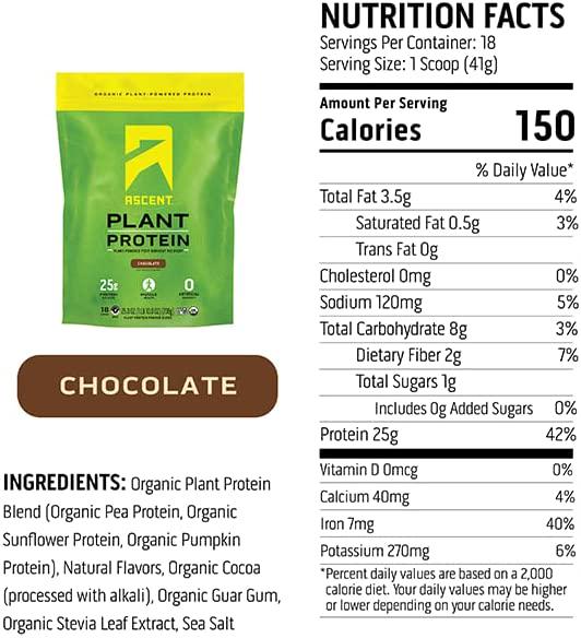 Ascent Organic Plant Based Protein Powder - Non Dairy Vegan Protein, Zero Artificial Ingredients, Soy and Gluten Free, No Added Sugar, 4g BCAA, 2g Leucine - Chocolate, 18 Servings