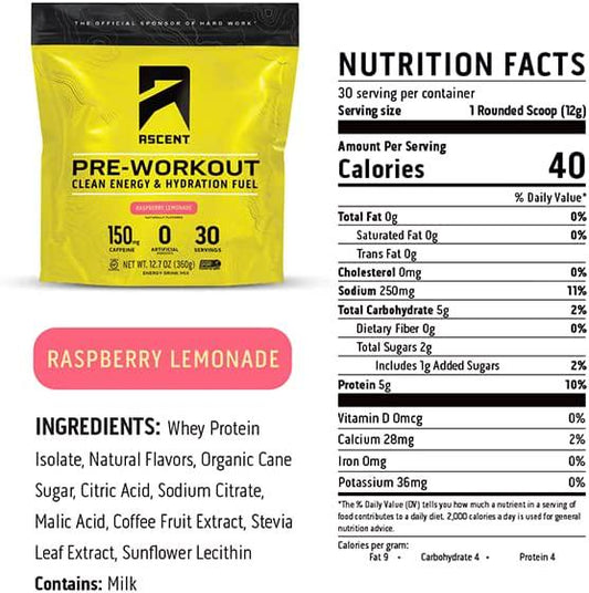 Ascent Pre Workout - Preworkout Powder, Zero Artificial Ingredients, Clean Energy for Men and Women, 150mg Caffeine - Raspberry Lemonade, 30 Servings