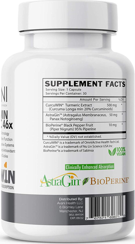 Avani Health - CurcuWIN Award Winning Turmeric Curcumin - Clinically Studied Anti-Inflammatory + Antioxidant - Enhanced Absorption with Bioperine and AstraGin Gluten Free - Non-GMO - 30 Vegan Caps
