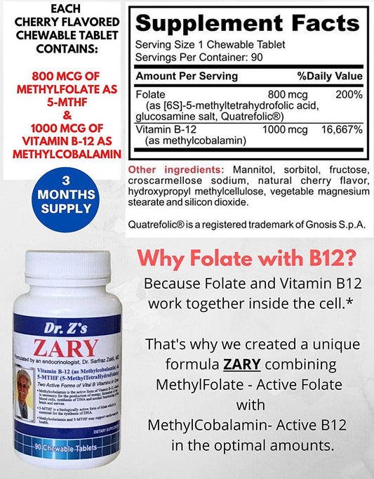 Dr. Z's - ZARY - Methylcobalamin, 5 MTHF Combination - Two Active Forms of Vital B Vitamins in One - 90 Count