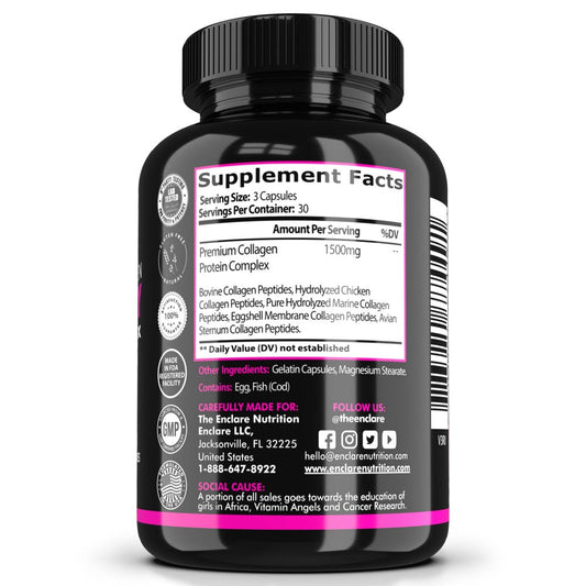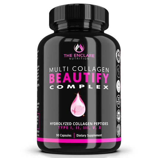 Collagen Pills Multi Collagen Complex Type I, II, III, V, X - Hydrolyzed Collagen Peptides Capsules, Hair Skin and Nails Vitamins, Joint Support, 90 Ct. - Enclare Nutrition Beautify