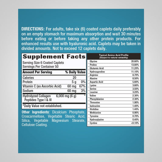 Collagen Pills 6000Mg | 300 Caplets | Hydrolyzed Peptide Supplement | Type I & III | Non-Gmo, Gluten Free | by Piping Rock