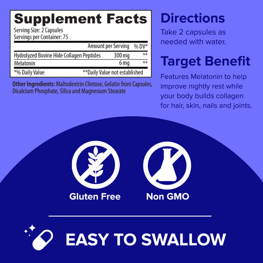 Collagen Pills Beauty Sleep with Melatonin 6 Mg - Boost Hair Skin Nails Joints - Hydrolyzed Collagen Peptides Supplement, 150 Capsules