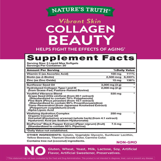 Collagen Beauty Supplement | 100 Liquid Max Softgels | Non-Gmo & Gluten Free Pills | Hydrating Formula | by Natures Truth