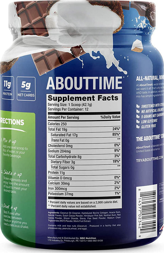 About Time Keto Shake with Bovine Collagen Protein + MCTs from Coconuts - 19g Fat, 11g Protein, 5g Net Carbs - Chocolate Coconut, 1lb Jar