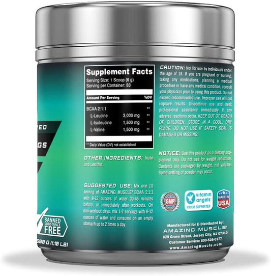 Amazing Muscle BCAA Dietary Supplement - 2:1:1 Branched Chain Amino Acid Ratio Net Weight 1.1lb