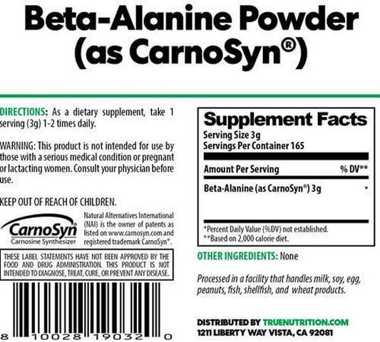 True Nutrition - Beta-Alanine Powder (as CarnoSyn) - Supports Increased Energy Production, Endurance, and Muscle Recovery - Vegan - 500 Grams
