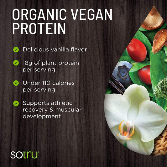 SoTru Vegan Protein Shake, Vanilla - 18.5 oz. - Whole Food, Plant-Based Protein Powder with Green Superfoods, Enzymes and Probiotics - USDA Certified Organic, Non-GMO, Gluten-Free - 21 Servings