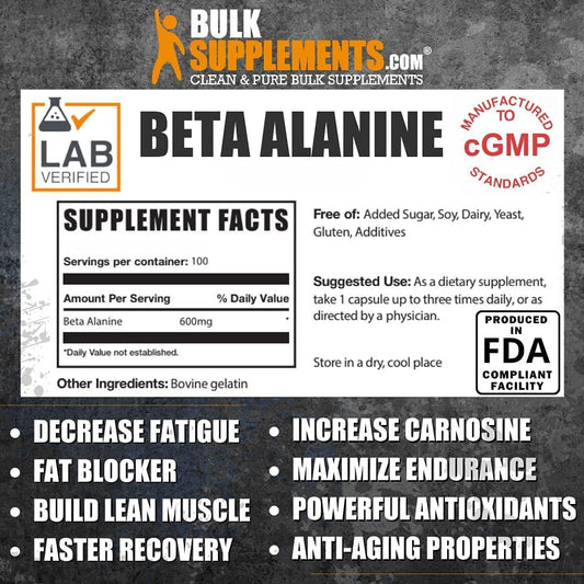 BulkSupplements.com Beta Alanine - Beta Alanine Pills - Unflavored Pre Workout - Vegan Pre Workout - Workout Recovery - BCAA Pills - BCAA For Women (100 Gelatin Capsules - 100 Servings)