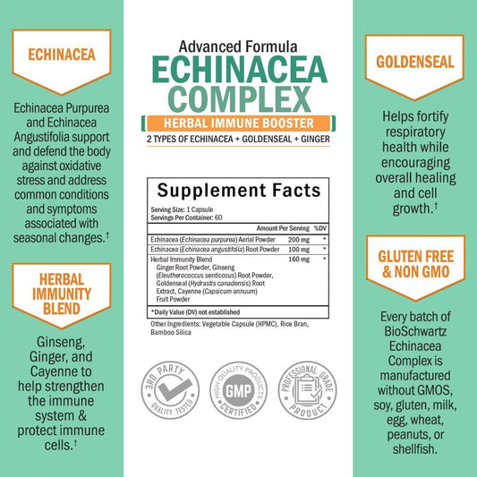 Echinacea Complex with Goldenseal - Herbal Supplement with Goldenseal, Ginger, 2 Types of Echinacea - Reduces Symptom Duration - Powerful Seasonal Support - 60 Capsules