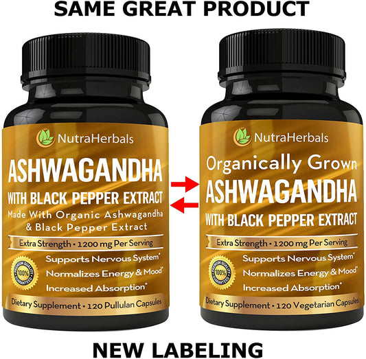 Ashwagandha Supplement Made with Organic Ashwaganda Root Powder 1200mg with Black Pepper Extract for Increased Absorption - 120 Pullulan Capsules