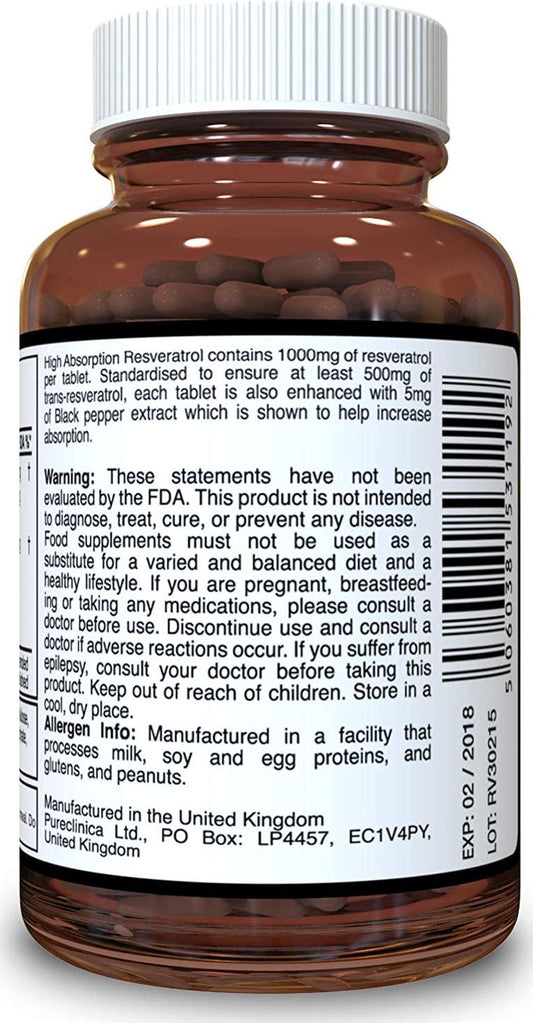 1000mg Resveratrol x 90 Tablets (3 Months Supply). 10 x Strength and with Black Pepper Extract for Faster Absorption. SKU: RV3