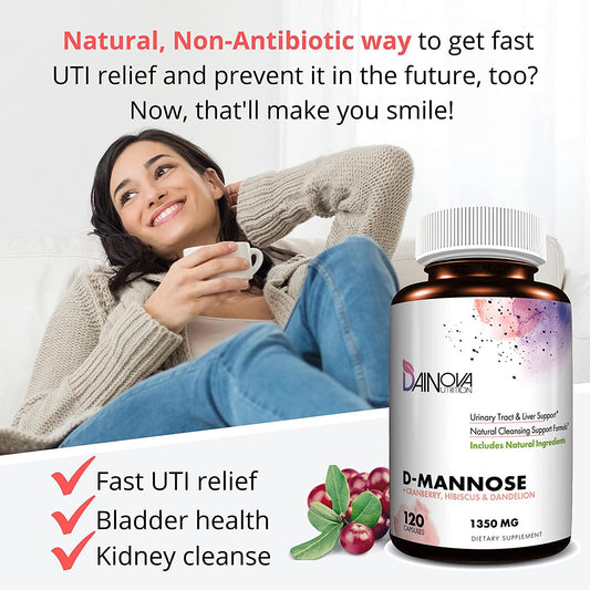 D Mannose Capsules 1350mg, D-Mannose with Cranberry for Urinary Tract Health, Bladder Control, UTI Treatment, Kidney Cleanse, Liver Support. Plus Hibiscus and Dandelion. Pills for Women and Men, 120 Ct