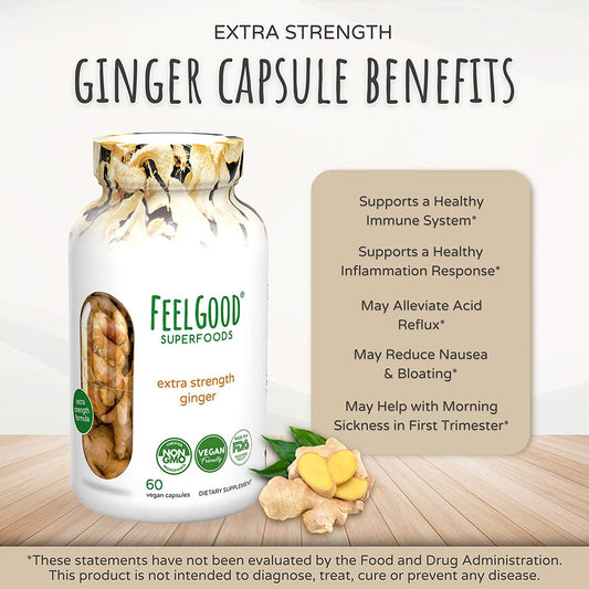 FeelGood Superfoods 1000mg Extra-Strength Ginger Root Capsules, Vegan Digestion Supplement Support for Nausea, Gas, and Bloating, 60 Count
