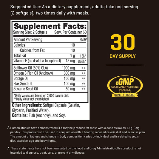 AbCuts CLA Belly Fat Formula - 120 Easy-to-Swallow Softgels - Omega 3 Fish Oil, Flaxseed Oil and Vitamin E - Helps Increase Antioxidant Supply and Healthy Body Composition
