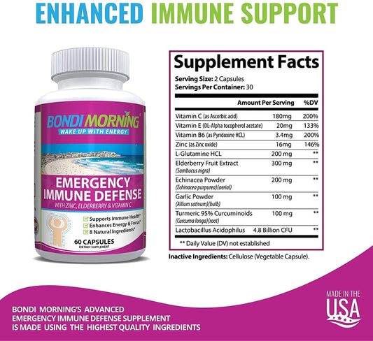 Emergency Immunity Support Vitamins Supplements – Vitamin C with Zinc Tablets + Elderberry Extract Bolster Immune System Response, Digestive Health, Energy, and Focus by Bondi Morning, 60-Count