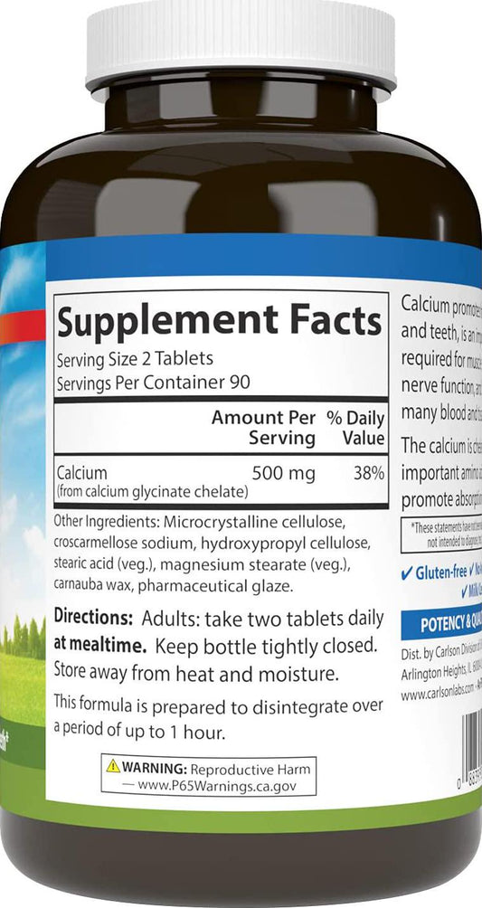 Carlson - Chelated Calcium, 500 mg, Bone Health, Nerve Function and Healthy Teeth, 180 Tablets