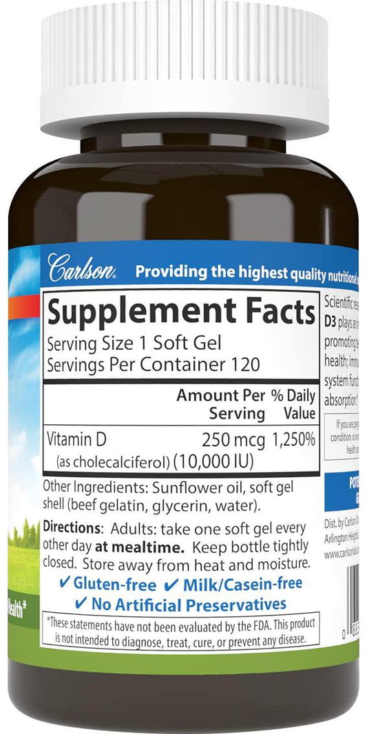Carlson - Vitamin D3, 10000 IU, Bone and Immune Health, Cholecalciferol, 120 Soft gels