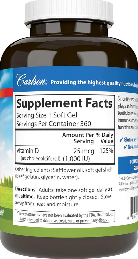 Carlson - Vitamin D3, 1000 IU (25 mcg), Immune Support, Bone Health, Muscle Health, Cholecalciferol, Vitamin D Supplements, Vitamin D3 Soft Gels, 360 Softgels