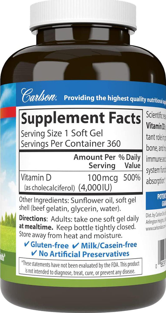 Carlson - Vitamin D3, 4000 IU (100 mcg), Bone and Immune Health, Cholecalciferol Supplement, Gluten Free Vitamin D Capsules, 360 Softgels