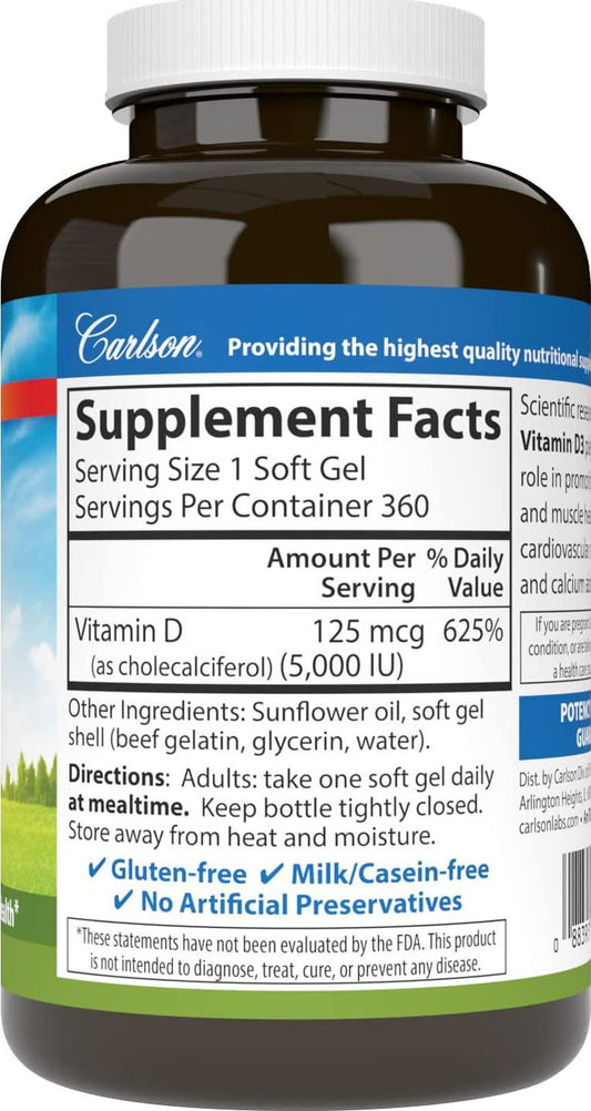Carlson - Vitamin D3, 5000 IU, Vitamin D Supplements, Bone and Immune Support, Vitamin D3 Softgels, Heart Health, Gluten Free Vitamin D Capsules, 360 Softgels
