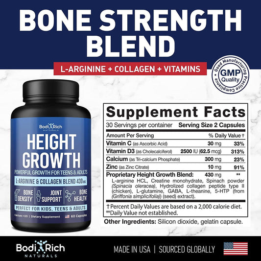 Bodirich Height Growth Maximizer - Natural Height Increase Pills - Made in USA - Growth Pills with Calcium for Bone Strength - Grow Taller Supplement for Bone Density and Joint Support - 60caps