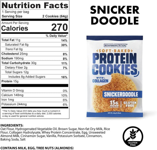 Bowmar Nutrition Protein Cookies, Collagen Cookies, Whey Protein Cookies, Soft Baked Cookies, 15g of Protein in Each Cookie, 6 Cookies Per Box. (Snicker Doodle, 6 Pack)