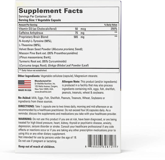 BrainWell Premium Nootropic Brain Support Supplement with Vitamin D3, L-Theanine, N-Acetyl-L-Tyrosine - Improves Cognitive Function and Memory and Enhances Focus for Men and Woman - (30 Vegan Capsules)