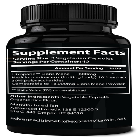 Advanced Bionetix Organic Lions Mane Supplement 120 Capsules. Brain Support Nootropic Immune System Support Mushroom Supplement. 10X Extract Similar to 18,000Mg, Contains Patent Pending Litropane™