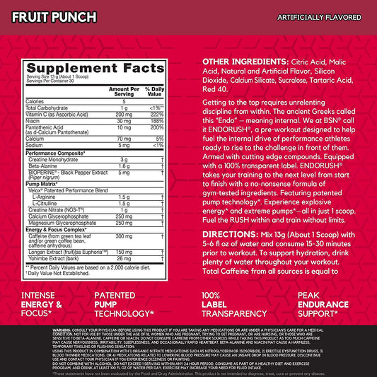 BSN Endorush Pre-Workout Powder, Energy Supplement for Men and Women, 300mg of Caffeine, with Beta-Alanine and Creatine, Fruit Punch, 30 Servings